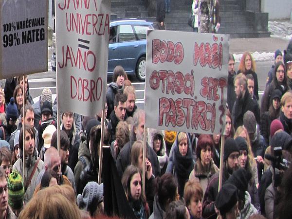 Delavci in študentje filozofske fakultete zahtevajo od vlade in parlamenta, naj zagotovita zadostno financiranje javnega visokega šolstva, in sicer v obsegu kot pred varčevalnimi ukrepi.
