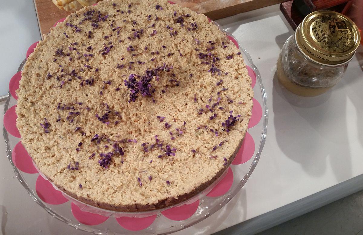 Sestavine za kremo: 200 g indijskih oreščkov namočenih čez noč, 100 g suhih fig predhodno za pol ure namočenih v topli vodi ali štiri večje sveže fige, 2 olupljeni hruški, 2 limeti - sok in lupinica , 1 pomaranča - samo lupinica, 2 žlici medu ali drugega sladila (agavin sirup), 1/2 žličke kardamoma, 1 žlica sladkorne mešanice (1 žlica suhih sivkinih cvetov in dve žlici sladkorja premešani s paličnim mešalnikom), 1 žlica svežih sivkinih cvetov (lahko izpustite), 1 mala skodelica svežih borovnic ali češenj, 100 g mletih mandljev, malo mletih ovsenih otrobov ali vode za uravnavanje gostote.